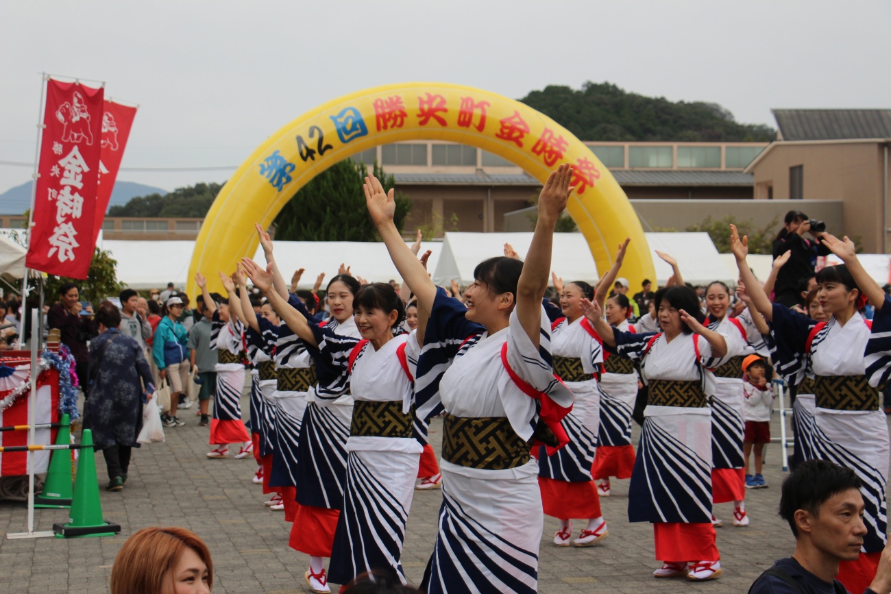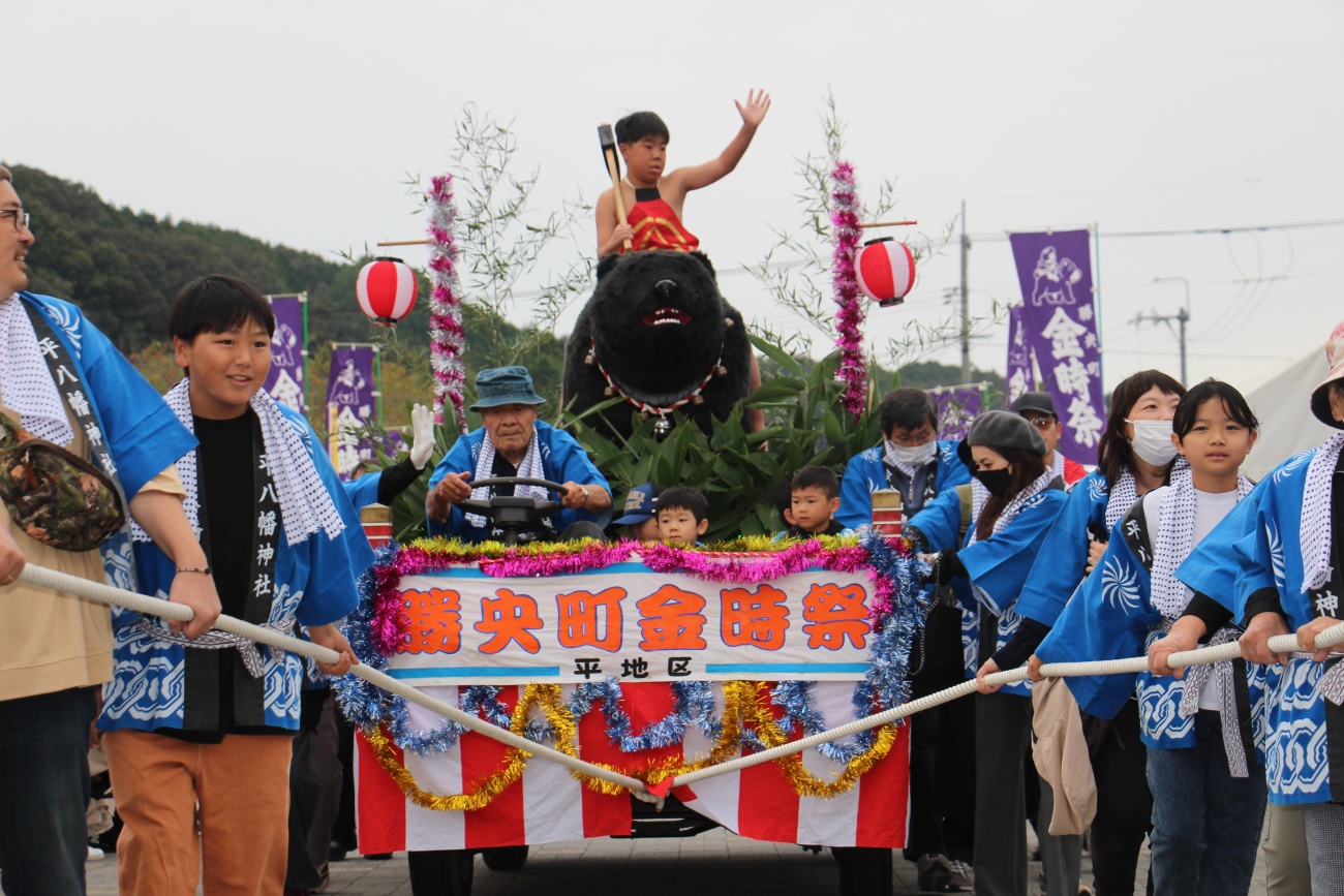今年で43回目を迎える勝央町を代表するお祭りです。金太郎に扮した子どもが熊の乗り物に乗る山車を先頭に、勝央町の子どもたちなどが歩くパレードが祭のオープニングをかざります。
