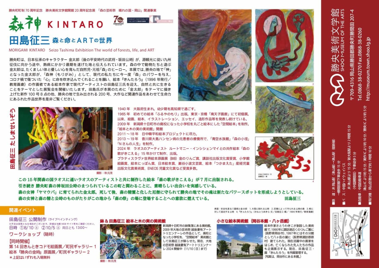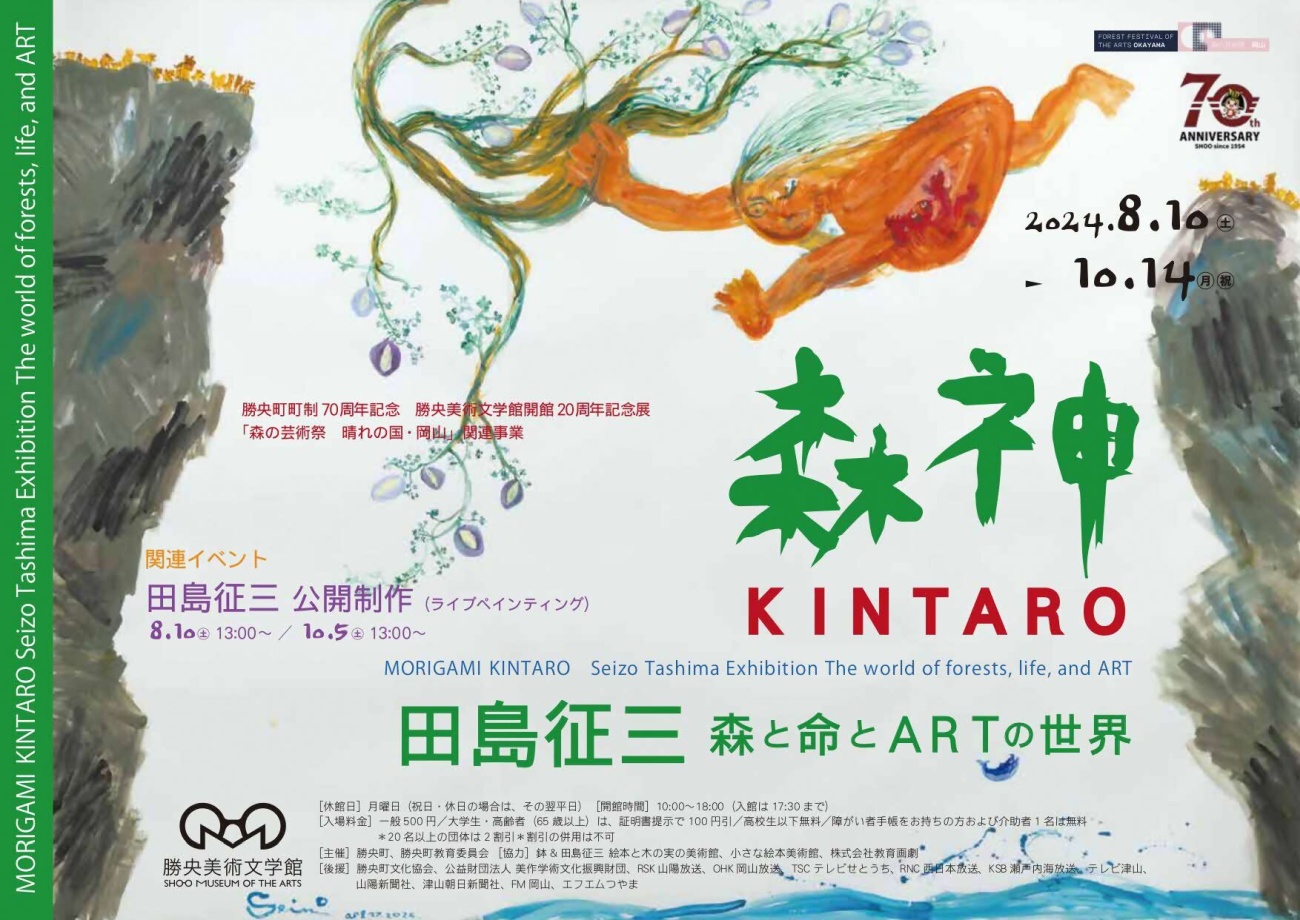 絵本「きんたろう」(1996年発行/教育画劇)の作画者である絵本作家で現代アーティストの田島征三氏を迎え、絵本原画13点と「金太郎・坂田金時」をテーマにした100号~200号の新作11点を含む作品展を開催する。また、8月10日(土)と10月5日(土)には、田島氏イブペインティングなどの関連イベントも開催予定。