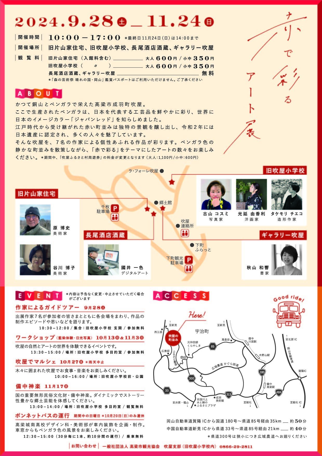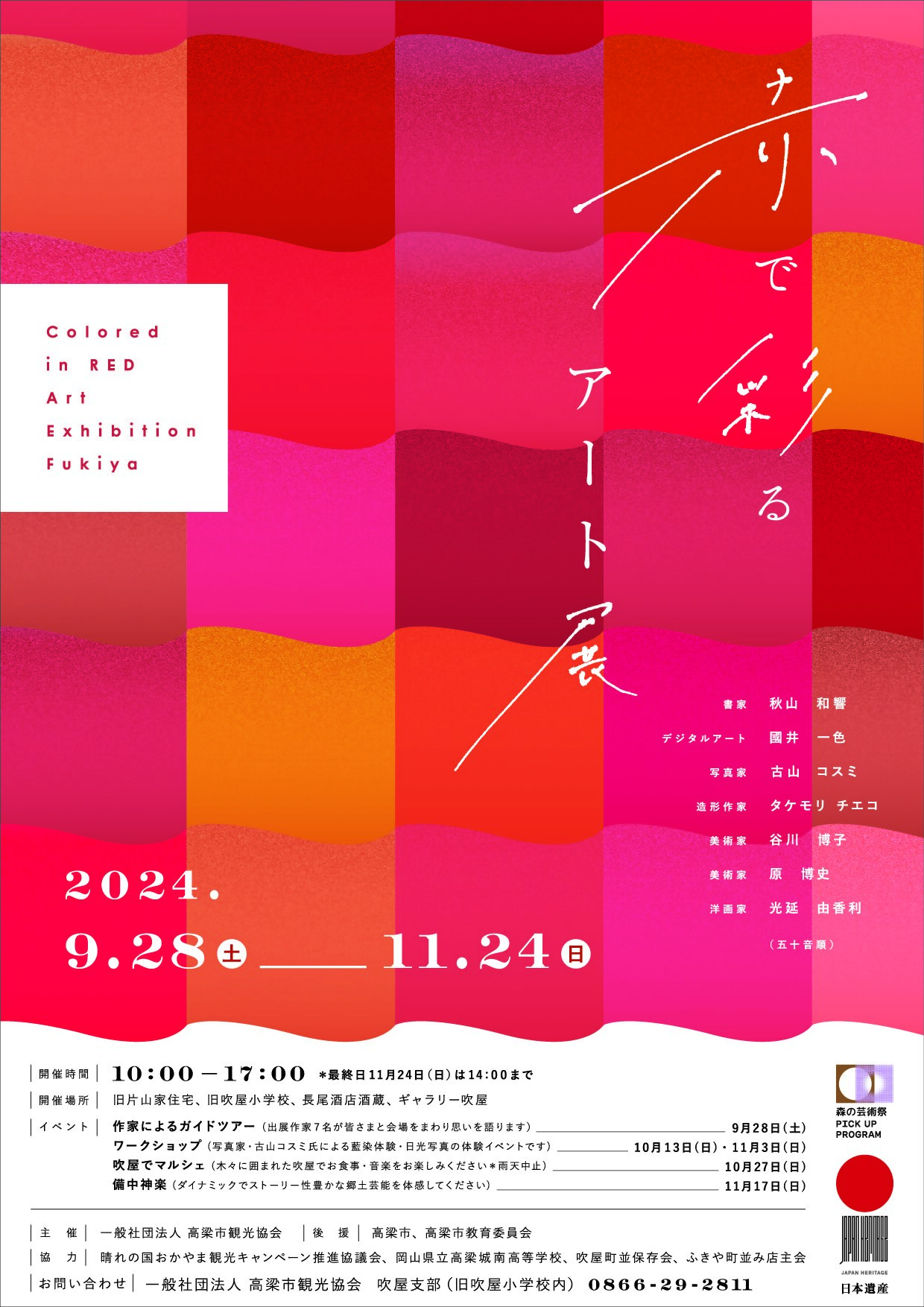 銅山とベンガラで栄えた「ジャパンレッド」発祥の地、備中吹屋で「赤」をテーマにしたアート展を開催。7名の作家による作品が展示され、いつもとは違った雰囲気の吹屋をお楽しみください。