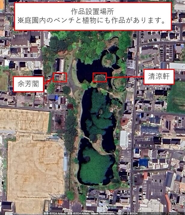 国の名勝にも指定されている衆楽園に、太田三郎氏は動植物に着目した作品を複数展示している。太田氏の解説のもと作品を鑑賞しながら庭園内を散策することで、そこに広がる豊かな生態系を感じるとともに、日常生活で見逃しがちな、生命の循環に思いをめぐらせることができる。
