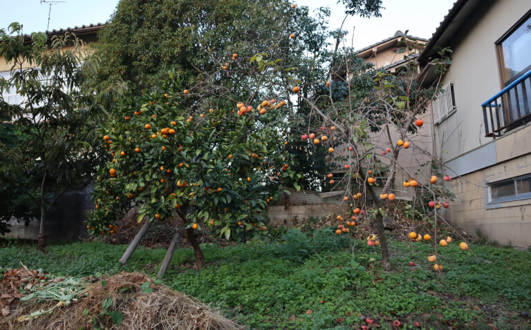 太田氏は、衆楽園内に繁茂する植物や樹木にネームプレートを取り付けた「衆楽植物園」、設問を通して、庭園内に生息する亀と飛来する鶴の数を想像させる「鶴亀算」、自宅近隣の庭に生える柿の木とみかんの木の約1年間の成長を映像に収めた「庭の情景」、柿の木が秋に熟し地面に落ちてゆく様子を映す「FALL」の4つの作品を庭園内に展示しています。