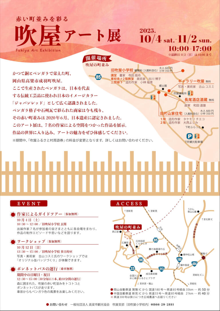 | 1 | 吹屋アート展 ★終了しました | 令和7年10月4日 | 令和7年11月2日 | 高梁市観光協会吹屋支HP チラシはこちらオモテ/ウラ |