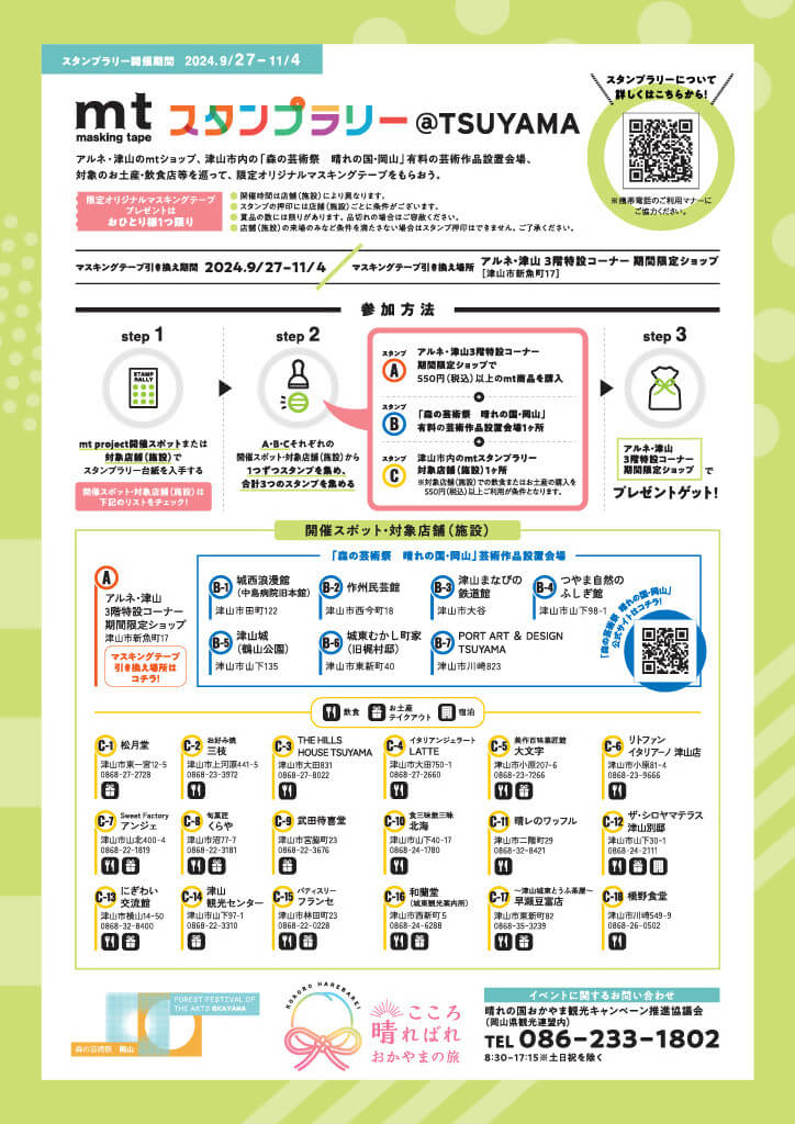 期間中は津山駅前にあるSLなどをmtで装飾し、津山市内にある森の芸術祭の有料作品展示会場やお土産・飲食店等を巡るスタンプラリーが実施されます。また、期間限定ショップがアルネ・津山3階特設コーナーに設置され、限定テープなども販売されます。