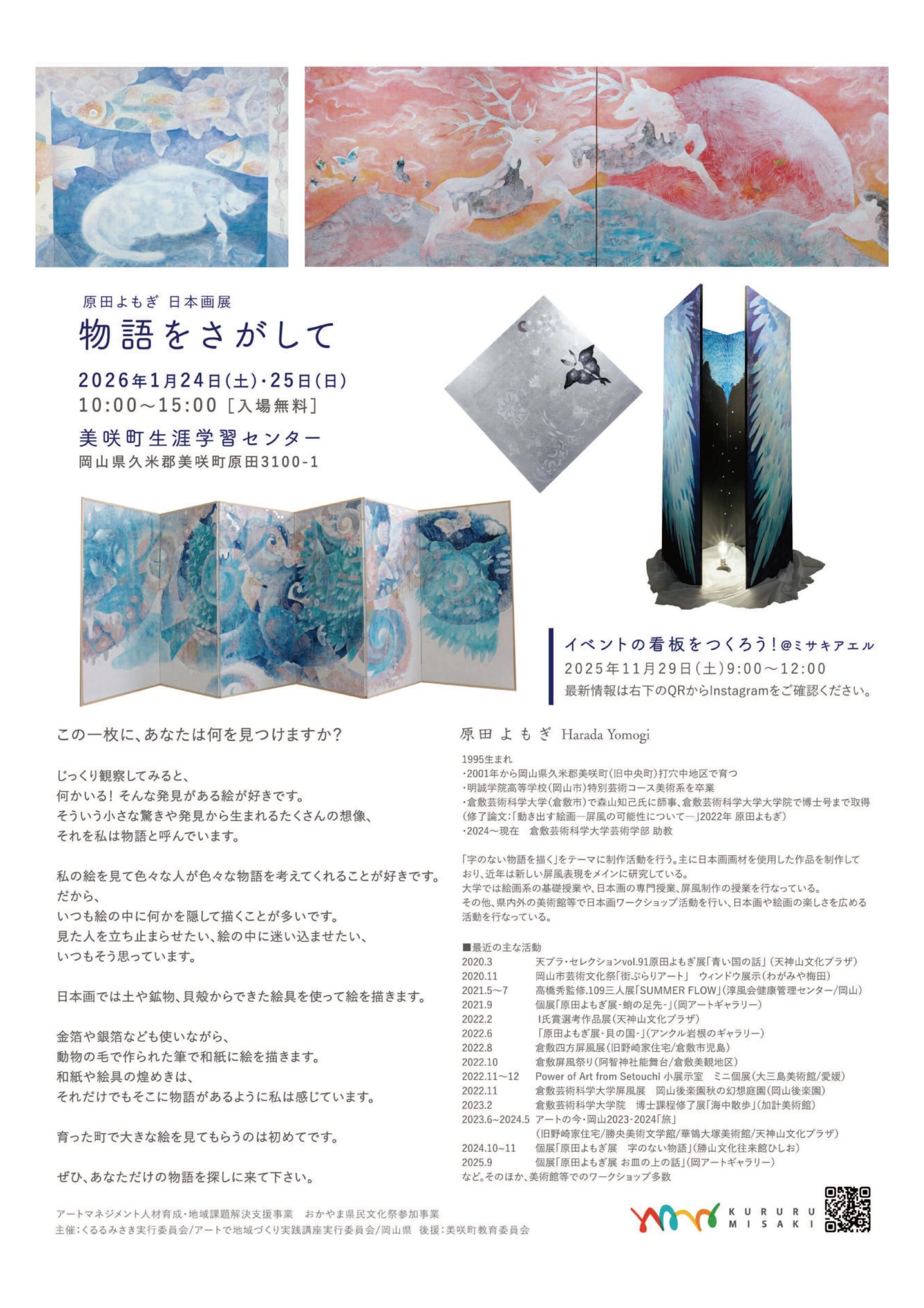 | 1 | 原⽥よもぎ ⽇本画展 「物語をさがして」★終了しました | 令和8年1月24日 | 令和8年1月25日 | チラシはこちらオモテ/ ウラ |